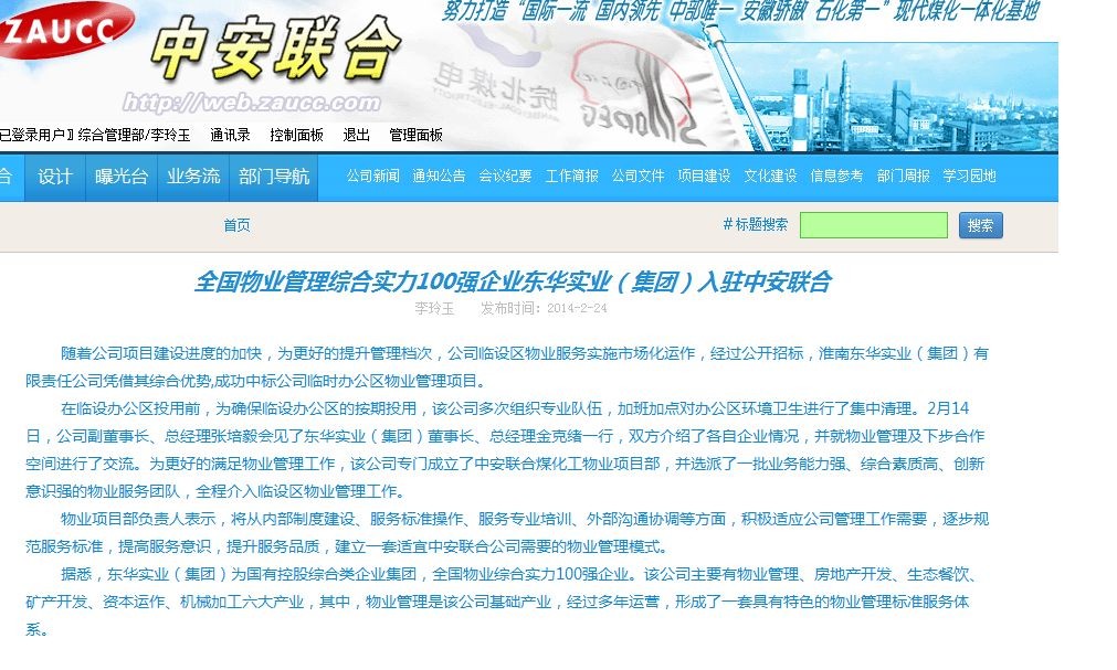 东华实业集团于2014年2月7日凭借综合优势,成功中标中安联合煤化公司办公物业服务。我们的品牌效应和服务质量,给甲方留下了很好的印象。打开中安联合企业网头条你会看到这样的报道。