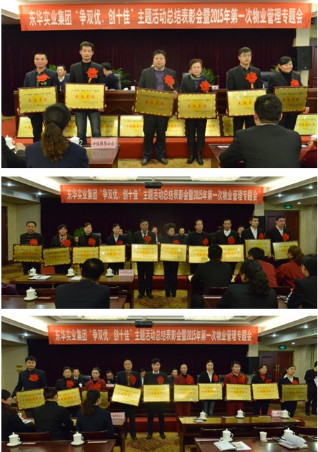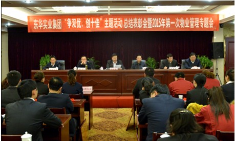 2015年1月23日,东华实业集团“争双优、创十佳”主题活动总结表彰会暨2015年第一次物业管理专题会在东华怡乐生态园二楼会议室召开。集团公司董事长、党委书记、总经理金克绪,党委副书记刘多君,副总经理王龙、刘晓明在主席台就座。淮南市房地产局副局长姚国辉,淮南市房地产局物业管理科科长鲍刚到会祝贺并在主席台就座。会议由党委副书记刘多君主持。