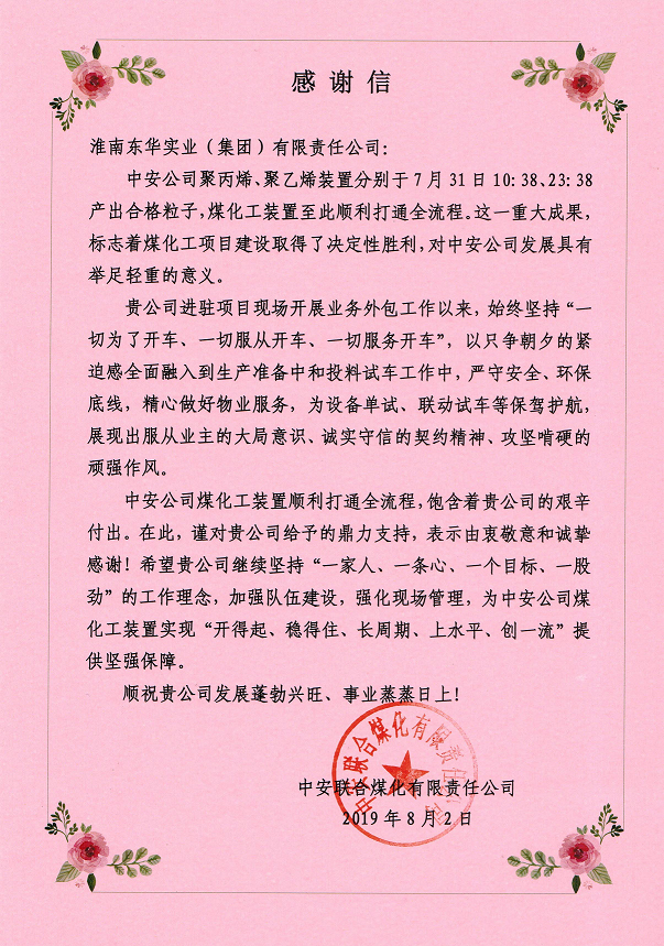 近日,中安联合煤化有限责任公司向东华实业集团公司发来感谢信,感谢东华实业集团中安项目部在业务外包工作中所付出的努力,有力助推了项目建设。