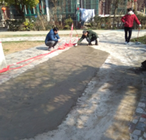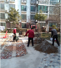 近日,物业办组织工作人员将景观台周围的木条拆除,并将事先准备好的水泥、沙子运到广场区域,先利用建筑垃圾进行填坑,再用水泥沙子将地面硬化。大家分工协作,干得热火朝天。工作人员经过一个早上的辛苦劳动,将路面铺平了,彻底将这个隐患消除了。