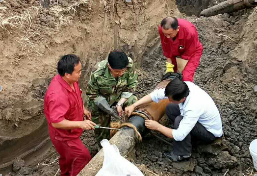 此次抢修任务紧张繁重,如不及时抢修,不仅影响矿生产,也影响生活用水。面对如此险情,东华丁集项目部抢修人员不慌不乱,有序排查,在确定漏水位置后,抢修人员制定了科学的施工方案,并现场设置排好反光锥和警戒线。由于漏水管道埋至在地下4米左右,人工开挖费时费力,抢修人员动用了挖掘机,最困难的是排空管道积水,抢修人员利用潜水泵进行管道排水,经过三个多小时,管道积水才排空。最后抢修人员争分夺秒的施工,对爆裂管道进行切割、拆除、更换、连接修复。当管道抢修完毕时,已经是凌晨了。