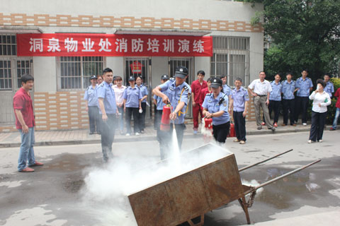 演练现场,文明村8号楼突发火情,小区工作人员迅速做出反应,立刻赶到现场拉起警戒线,一边用喇叭对楼内居民喊话,一边用对讲机联系救援,按照消防应急预案,工作人员有序地从各楼层的安全通道,带领居民紧急疏散。疏散结束后,由洞泉处保卫股长为保安员讲解、示范干粉灭火器的操作使用和水带的快速准确甩收。为考核物业从业人员能否熟练操作灭火器材,一个装满了木材的铁皮手推车内火焰熊熊,在场的保安和工作人员轮番上场,将手推车内火焰扑灭。整个演练过程,保安和工作人员一丝不苟、认认真真,按照规范的要求,动作整齐到位,灭火时的奔跑和站位、灭火器的拔销和喷灭、水带的甩收和枪头接驳等动作一气呵成、干净利落,得到围观业主的交口称赞。