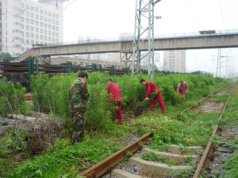 近日,大通物业处机关和综合队工作人员由处领导亲自带队,对淮南市火车站轨道两侧杂草进行清理,并修剪了绿化带。