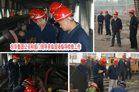 一时间,放弃休假进行维修的人员进入到各自工作岗位,已经为检修提前准备好的各种材料、备件准备到位,各项检修工作按照预定安排,有序进入检修程序。该处停产检修指挥中心的调度室,异常繁忙起来。期间,东华集团副总经理王胜会、副总师祁庆伟、安监处处长戚良松、生产技术部部长汪显河等集团公司和部门领导亲临现场指导检修工作,同现场维修技术人员一道,研究施工方案,指挥安装和维修,参与检修,同从指挥、奋力一线。只见广大干群身穿工作服、要扎皮带和工具、头戴安全帽,一身煤灰、满手油污的50多名技术职工,从清晨开始,提前将皮带机巷需更换的皮带吊装到位,顶着绵绵细雨和阵阵凉风,按照安全施工方案和技术措施,紧张而忙碌地拆卸损坏的皮带,有条不紊换装新皮带,优化延伸调整运输轨道等各项检修项目与计划。于6月11日11时许提前一天半完成检修更换皮带任务。赢得了矿方领导的高度好评。展示了顾桥物业管理处过得硬的工作作风,打出了“东华”品牌,弘扬了“最可爱的东华人”风采。