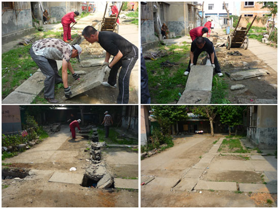6月17日,大通物业处综合队维修了在不久前卫生突击中,被城管铲车压坏的下水道盖板,善始善终的将好事办好。