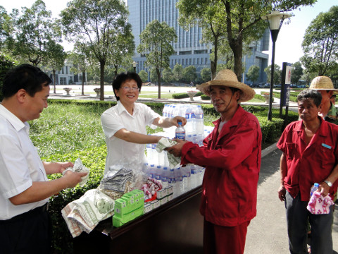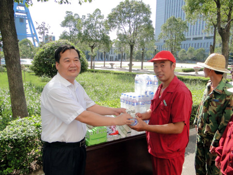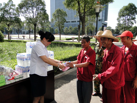 对于常年高温的洗衣机房,针对蒸汽管温度过高问题,该队男职工找来隔热材料,将其包裹,有效降低了室内温度;对于新接手的车房,针对值班室在车房外且无任何降温设施的情况,项目部领导向矿方争取了空调,第一时间安装到位;对于奋战在工广路的清洁工,领导们为他们送去了防暑降温的药品和食品,并一再叮嘱大家要轮流作业,适当休息,如有不适要立即停下工作或报告班队长。同时,做好内部稳定工作,营造团结和谐的工作氛围,保障职工平安度夏。