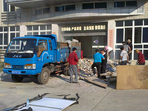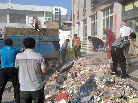 8月7日下午,谢家集物业分公司在班子成员的带领下,组织机关工作人员,对淮矿救护大队旧办公大院开展突击清运垃圾活动,冒着摄氏38的高温,顶着炙热的烈日,面对着散落一地的建筑垃圾,一时间,铁铲清脆的声音,你一铲我一铲的就干了起来,汗水湿透了衣背,额头上的汗水被烈日晒的闪闪发光,大家不畏酷暑,依然挥汗大干,经过大家2个小时的集中突击,共装运垃圾五卡车,最终在大家的共同努力下,大院的垃圾杂物得到彻底清除,得到了业主单位的高度赞扬。