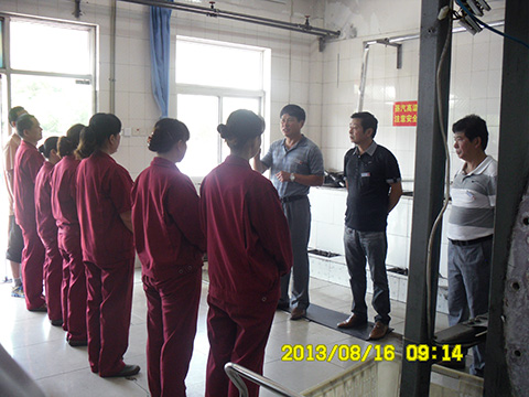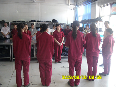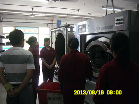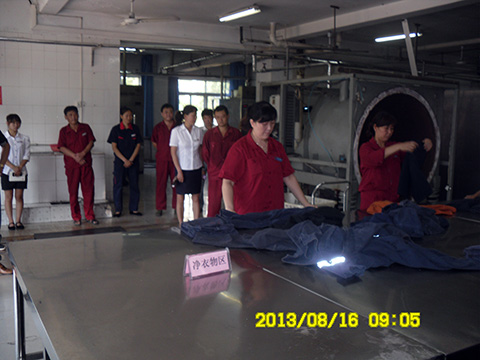 现场学习首先由两组交接班人员列队在班长的监督下对现场设备设施的安全情况及工作中需注意的事项进行交接,并互嘱注意安全;然后洗衣女工为大家演示了收衣、洗衣、烘干、叠衣、上架整个工作流程,手指口述了洗衣、烘干流程,强调了这两个流程的安全重要性。最后项目部领导对洗衣房提出了创建无止境、扬长避短、精益求精不断提高服务质量,同时要求其他车间以洗衣房为标杆,认真贯标、执标,确保年底全面达标的要求。
