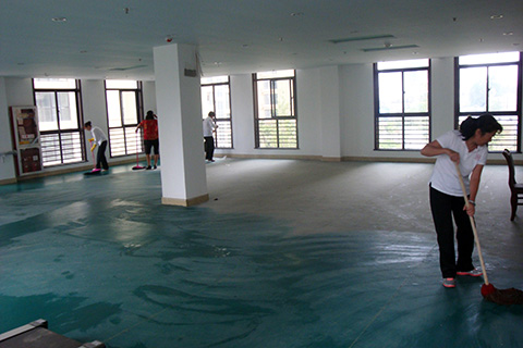在突击现场,物业处领导亲自带队,脏活累活带头干,在他们的带动下,其它人员也热火朝天的干了起来,整整一天的忙碌,让烟草局办公楼的面貌焕然一新,得到了甲方的一致认可。