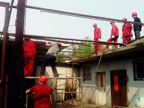 潘北矿职工一食堂后院彩板大棚由于使用时间较长,目前梁、柱锈蚀严重,已出现局部坍塌,为了及时消除安全隐患,潘北项目部领导班子高度重视,首先组织相关人员经过现场勘察确定最佳施工方案及安全防护预案,同时,积极向矿领导反映,寻求支援,最后确定由我项目部施工,矿方提供钢材及其他帮助。