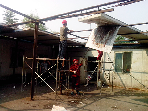 近日,项目部精心组织精干人员对彩板棚进行全面拆除施工。施工过程中,为确保安全,项目部安全副经理全程盯现场。同时,为节支降耗,最大程度的回收材料,在拆除彩板棚时,现场要求大家精心施工,细化每一步操作,确保拆除的部分彩钢瓦能再次使用。由于事前准备充分,分工协作合理,施工过程进行的十分顺利,仅仅用了一天半的时间就完成全部拆除工作,为下一步重新搭建彩板棚赢得了充分的时间,得到了矿方有关单位的高度赞扬。