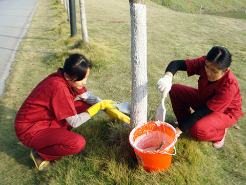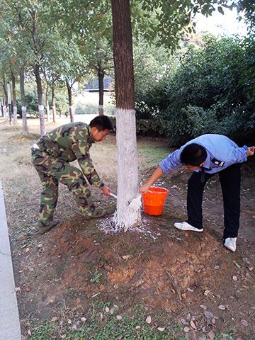 生态新城物业处全体员工齐出动,在山南物业办主任的带领下把生石灰、水等原材料按比例调配,将其混合充分搅拌而成为树木涂白所需材料,按照树干离地一米的地方作为标记,确保涂成统一高度,保证树木的美观。经过2天的努力,最终大家齐心协力完成了今年冬季山南物业办园区树木防寒养护工作。