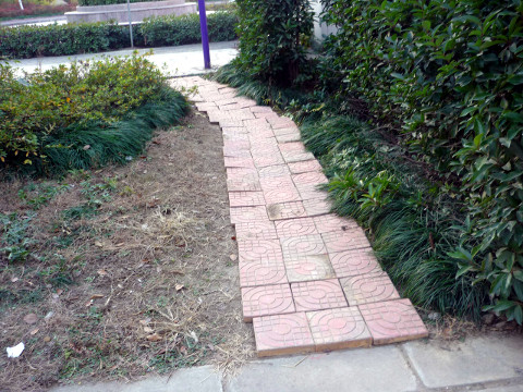 为了节约成本, 物业处没有上报资金计划,而是借大通区修整市政道路之机,捡拾被淘汰的旧花砖,并转运至二区。花砖到位后,二区小区办工作人员一起动手,很快在小广场绿化修成了一条便民小道,获得了业主的一致好评。