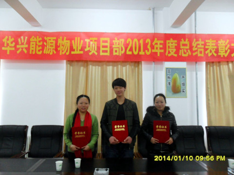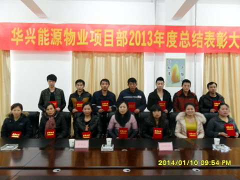 2014年1月11日上午,华兴能源物业项目部在一楼会议室隆重召开了2013年度总结表彰大会。会上经理张国全同志代表项目部作了工作报告。报告回顾了上一年度的工作以及存在的不足,并对2014年的工作做了全面的部署。同时,会议还宣布了取得突出成绩的2013年度三个先进集体和16名先进个人,并对他们进行了公开表彰。