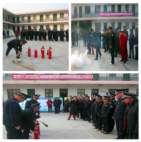 分公司分管领导亲临现场组织安排,基层各单位负责人、消防专员及保安员达65人左右参加此次消防演练培训。首先保卫股股长贾全华进行了消防理论知识(火灾报警、火场自救及逃生方法)等消防安全基本常识讲解。其次全面讲解了灭火器使用方法及消防水带的操作程序,由保安班长进行现场演练。最后由各单位保安员轮流进行实际操作,整个演练过程有条不紊地进行,达到了预期效果,同时也是对防火预案的一次有效检验。