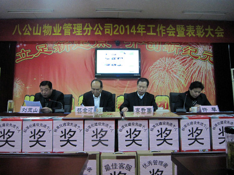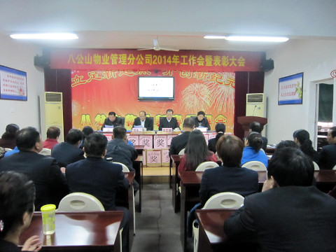 2014年1月17日下午,八公山物业管理分公司在视频会议室召开了2014年工作会,会上宗升国经理对去年的工作进行了回顾,表彰了两个先进集体和27名先进个人,其中11名为劳务承揽工,以此激励着分公司全体干群更加努力地工作。