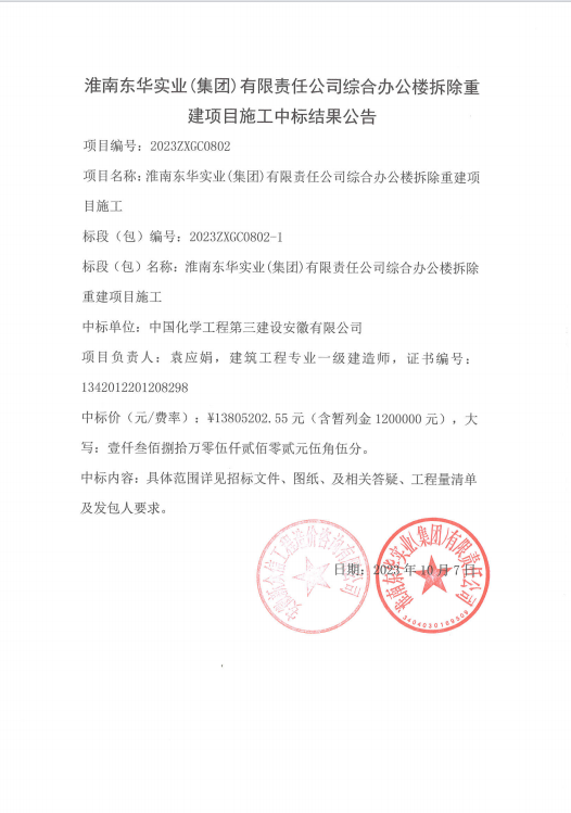 淮南东华实业(集团)有限责任公司综合办公楼拆除重建项目施工中标结果公告