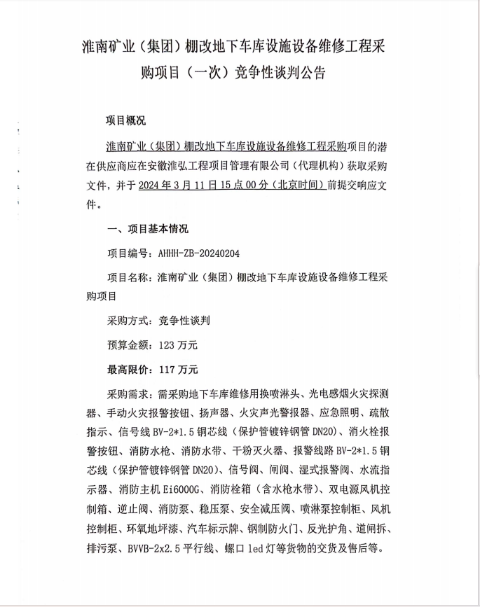 淮南矿业(集团)棚改地下车库设施设备维修工程采 购项目(一次)竞争性谈判公告