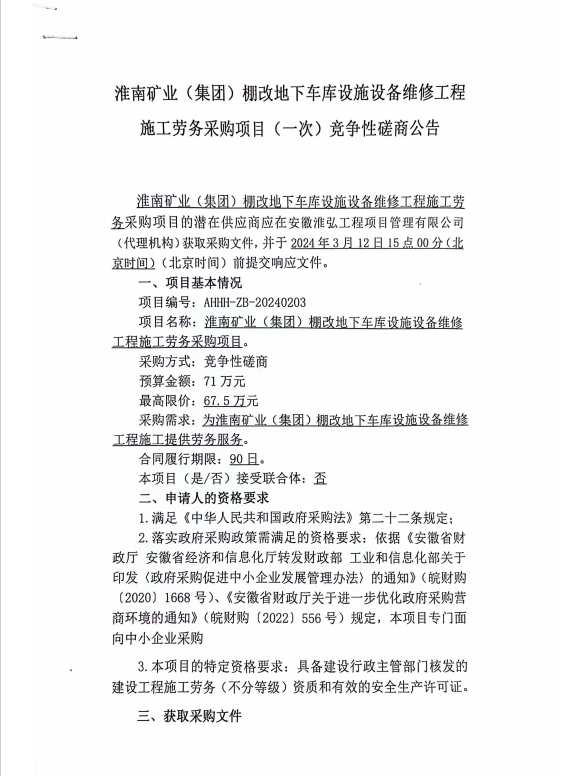 淮南矿业(集团)棚改地下车库设施设备维修工程施工劳务采购项目(一次)竞争性磋商公告